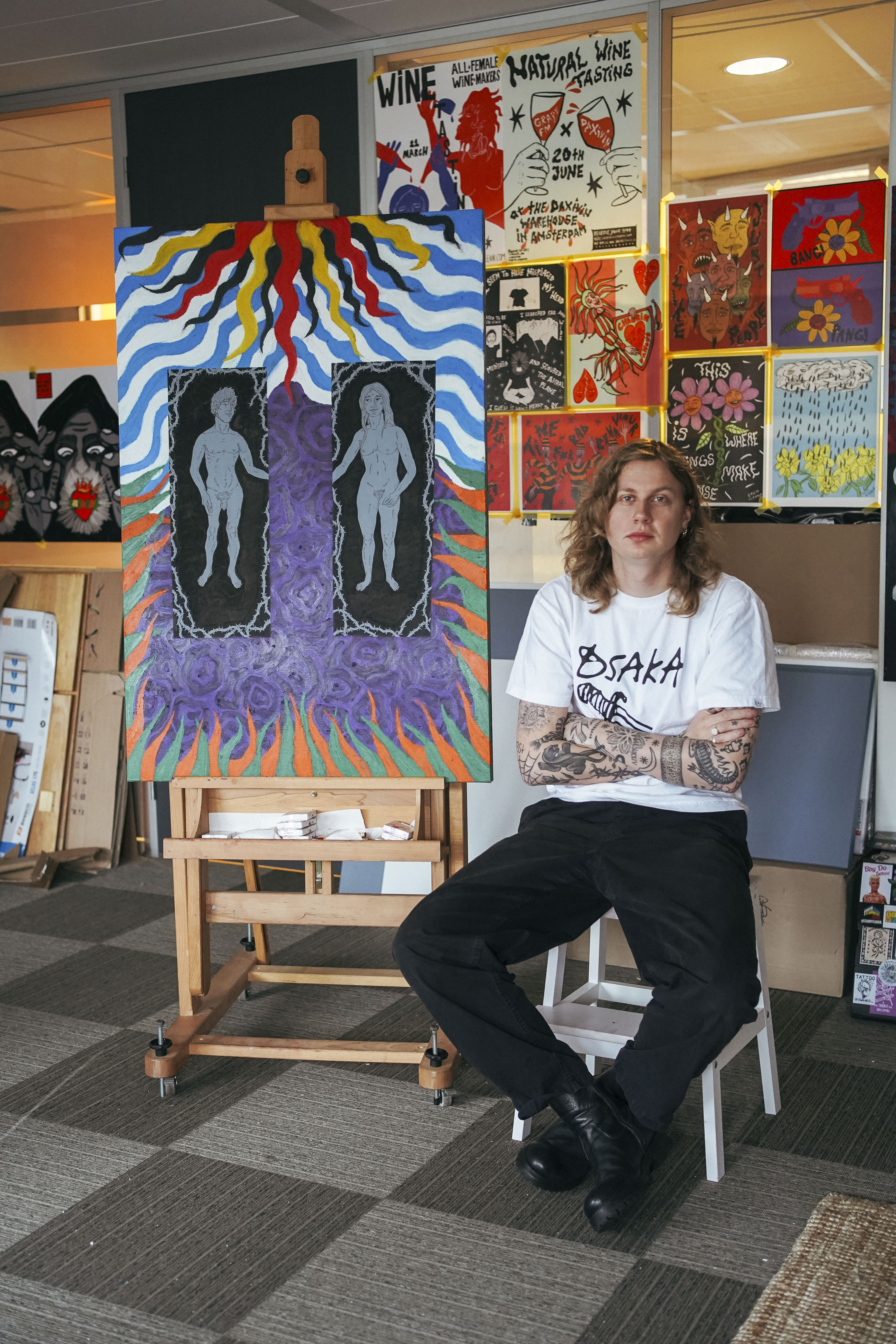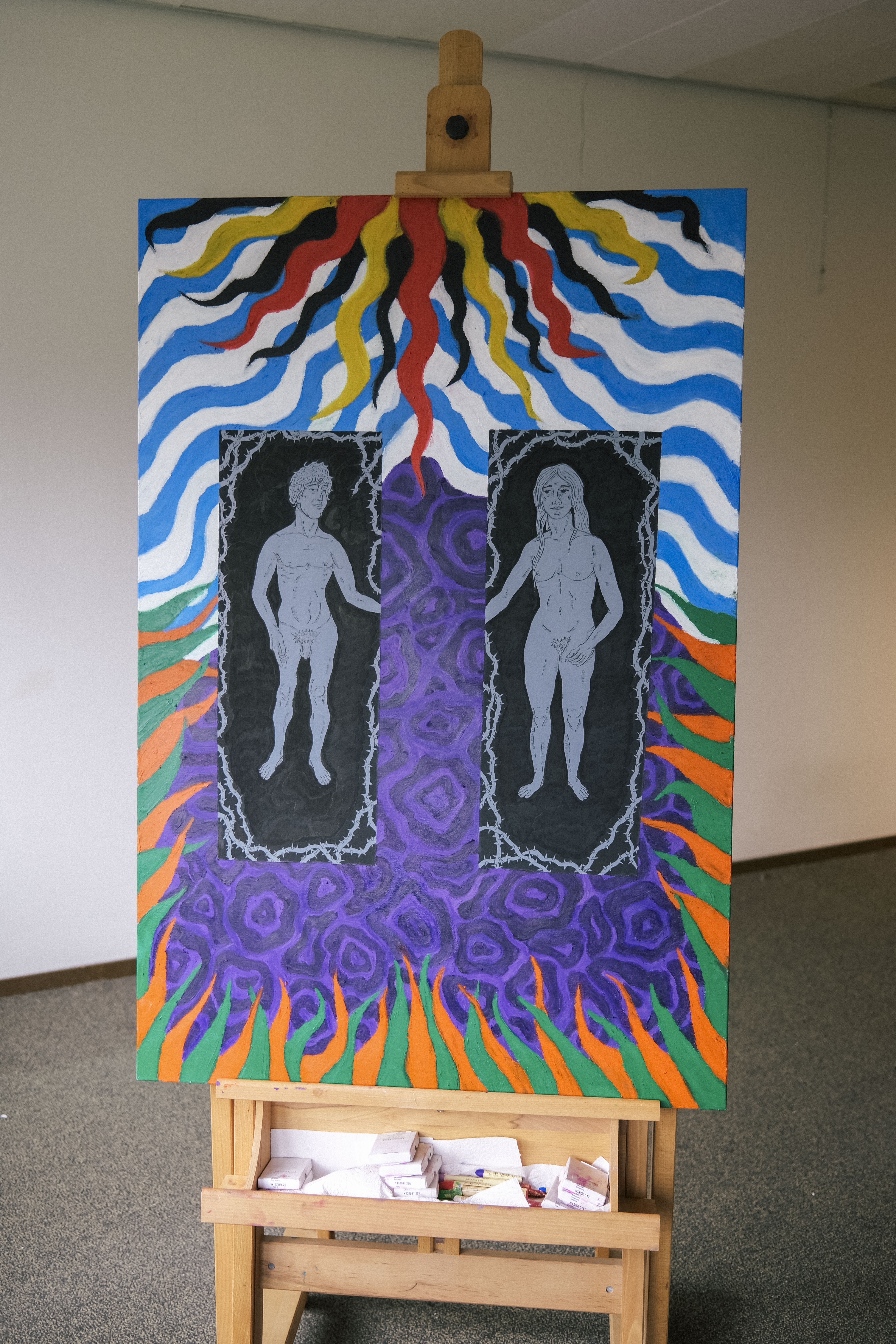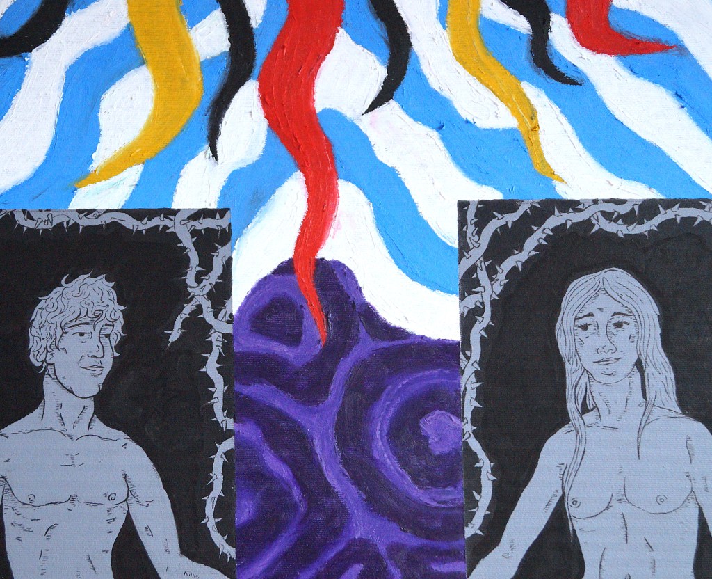 Much of my work is inspired by religion and its imagery. This painting is my version of how Adam and Eve are classicly portrayed. With it, I want to raise questions about whether paradise was truly a gift, and not a set-up for failure.