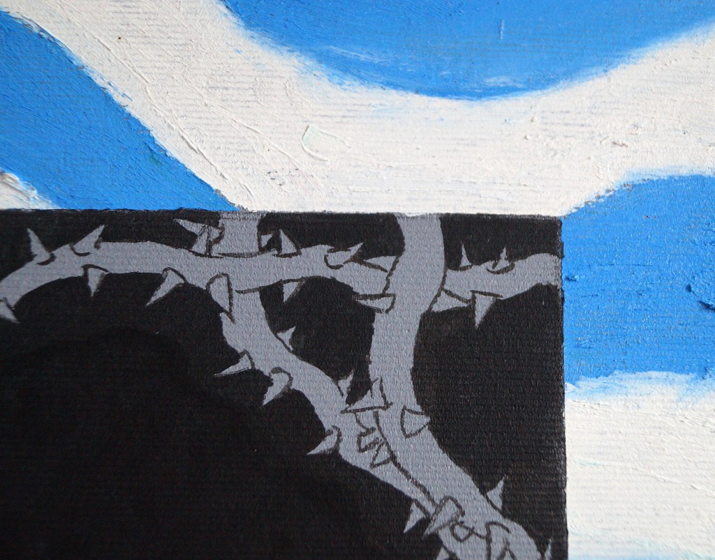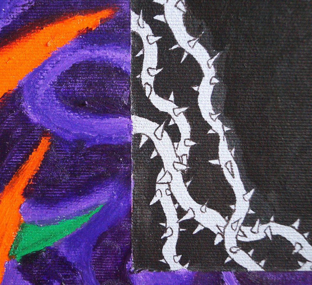 Oil pastels and paint marker on 80×120 canvas.