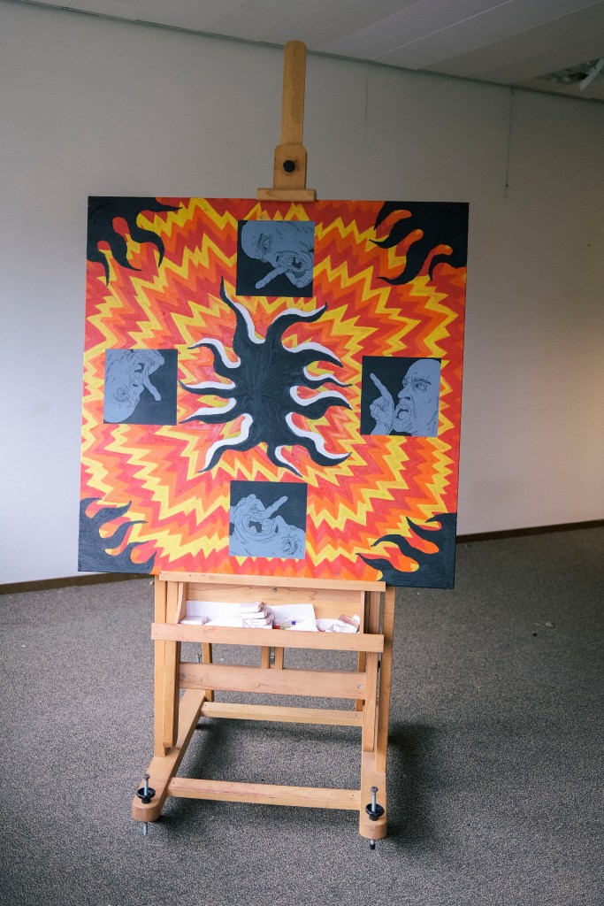 This painting was inspired by the constant circle of screaming that seems to go on in politics, in social circles, and also the constant dialogue going on inside of my head. A constant cycle of pointing fingers and shifting blame, with no results ever.