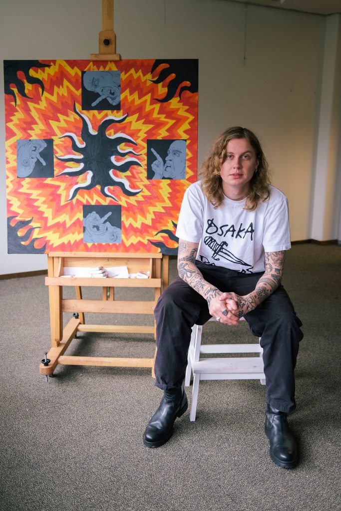 Oil pastels and paint marker on 100×100 canvas.