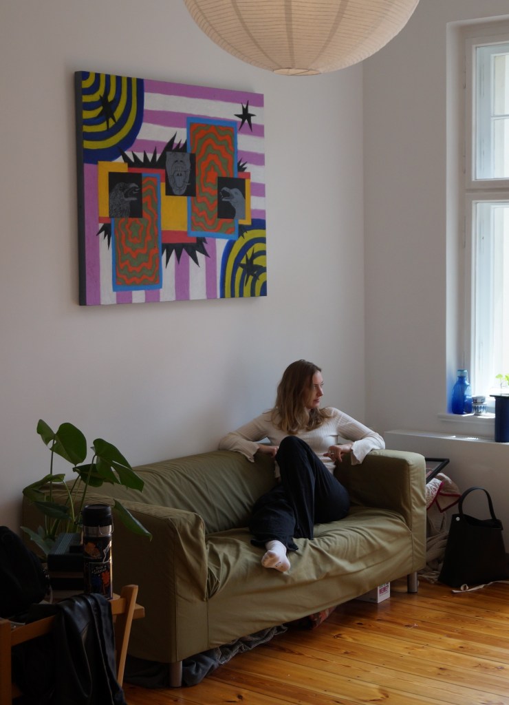 Emi had just moved in to her new flat, and the walls were completely empty. She commissioned me to make her a big painting, with tons of colour, to fill up the space. The only wish she had was that I would include a certain shade of green. The other colours were selected around this.