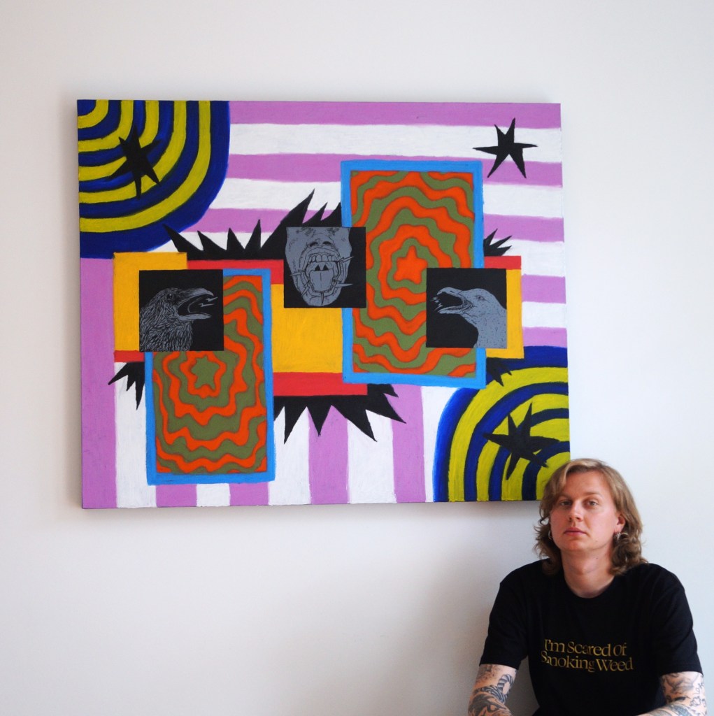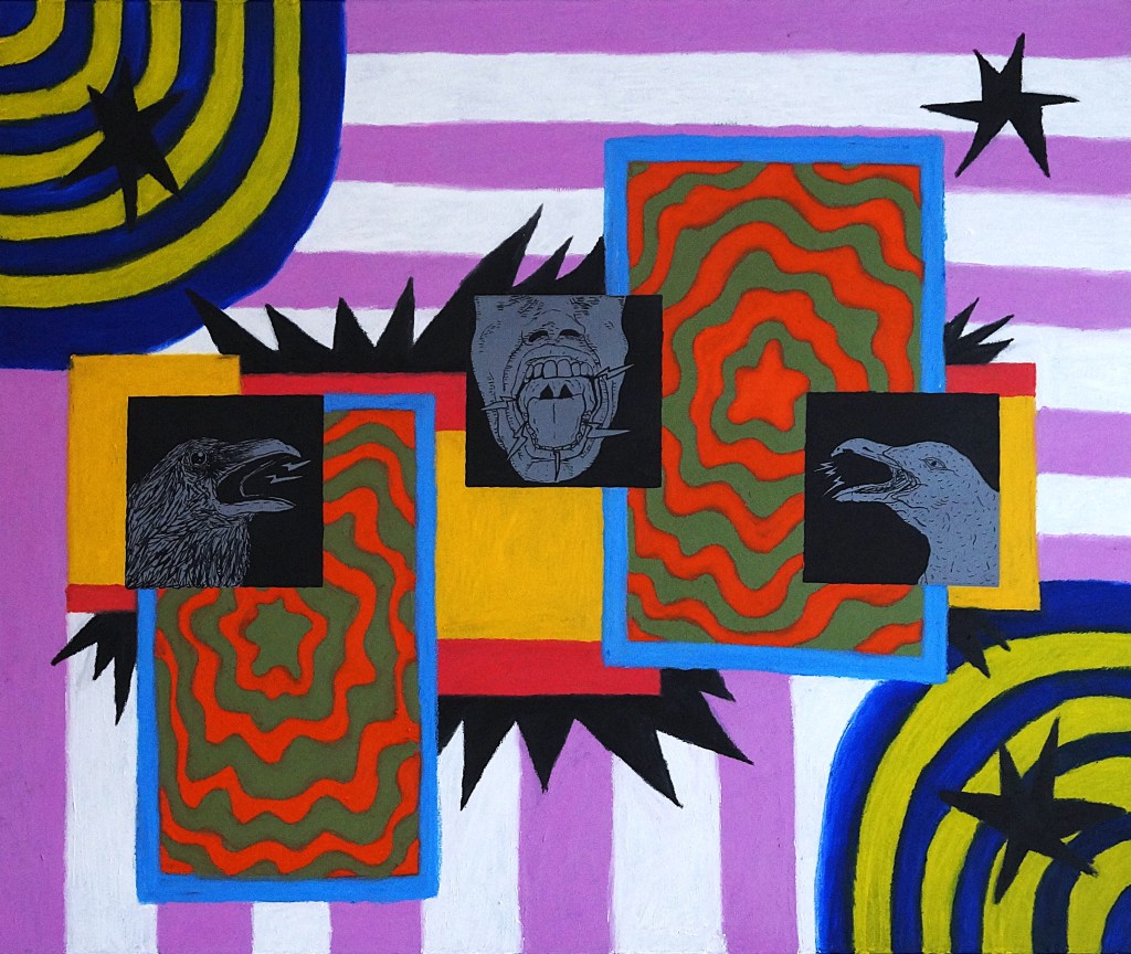 As Emi is a big fan of punk rock and other loud music, my first thought was ‘noise’. This lead to the idea of the somewhat chaotic mix of patterns, shapes, and colours, and the screaming person, cawing crow, and the squawking seagull. They ended up being a metaphor for internal noise that comes from not giving yourself the attention and peace you need -not feeding the birds-.