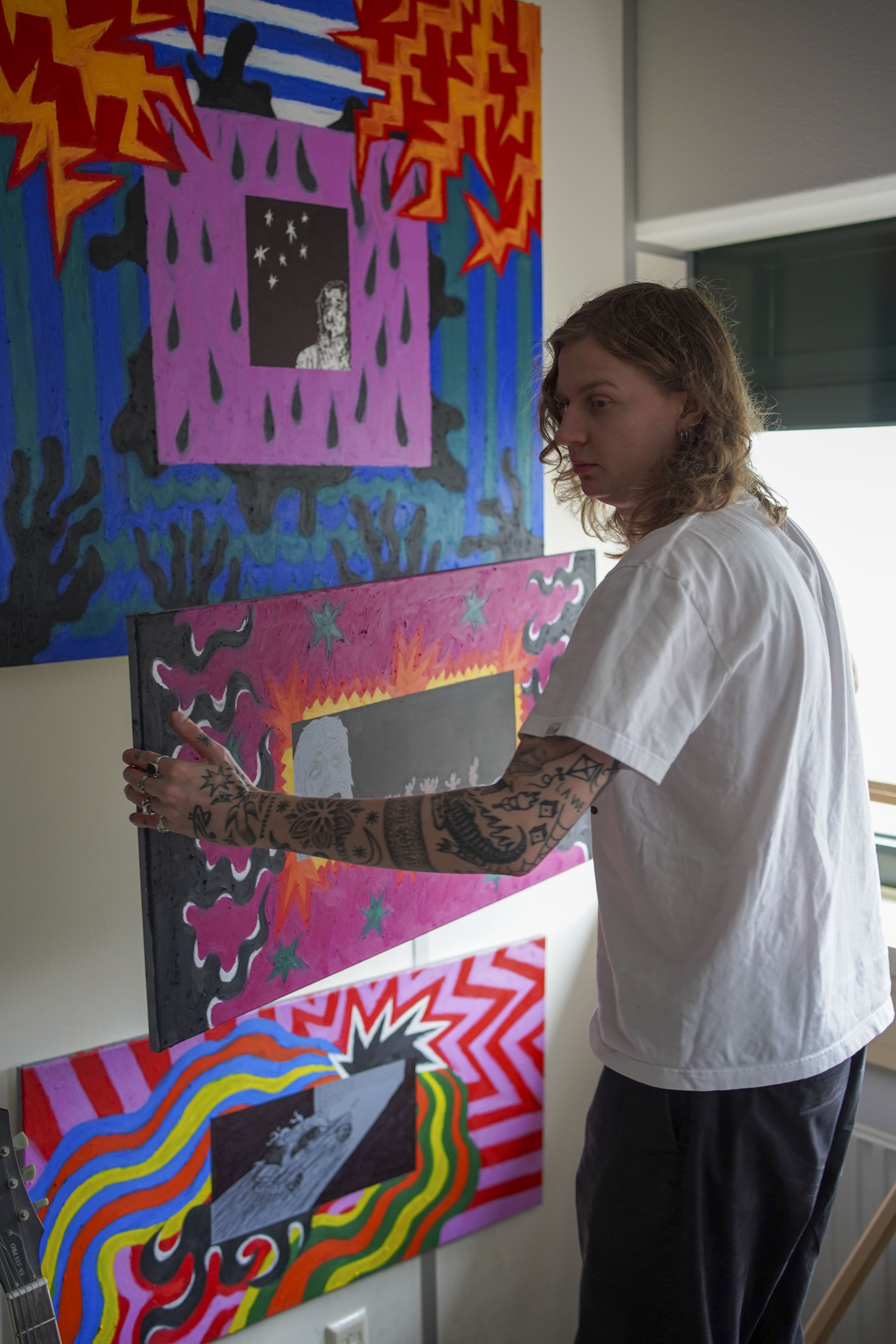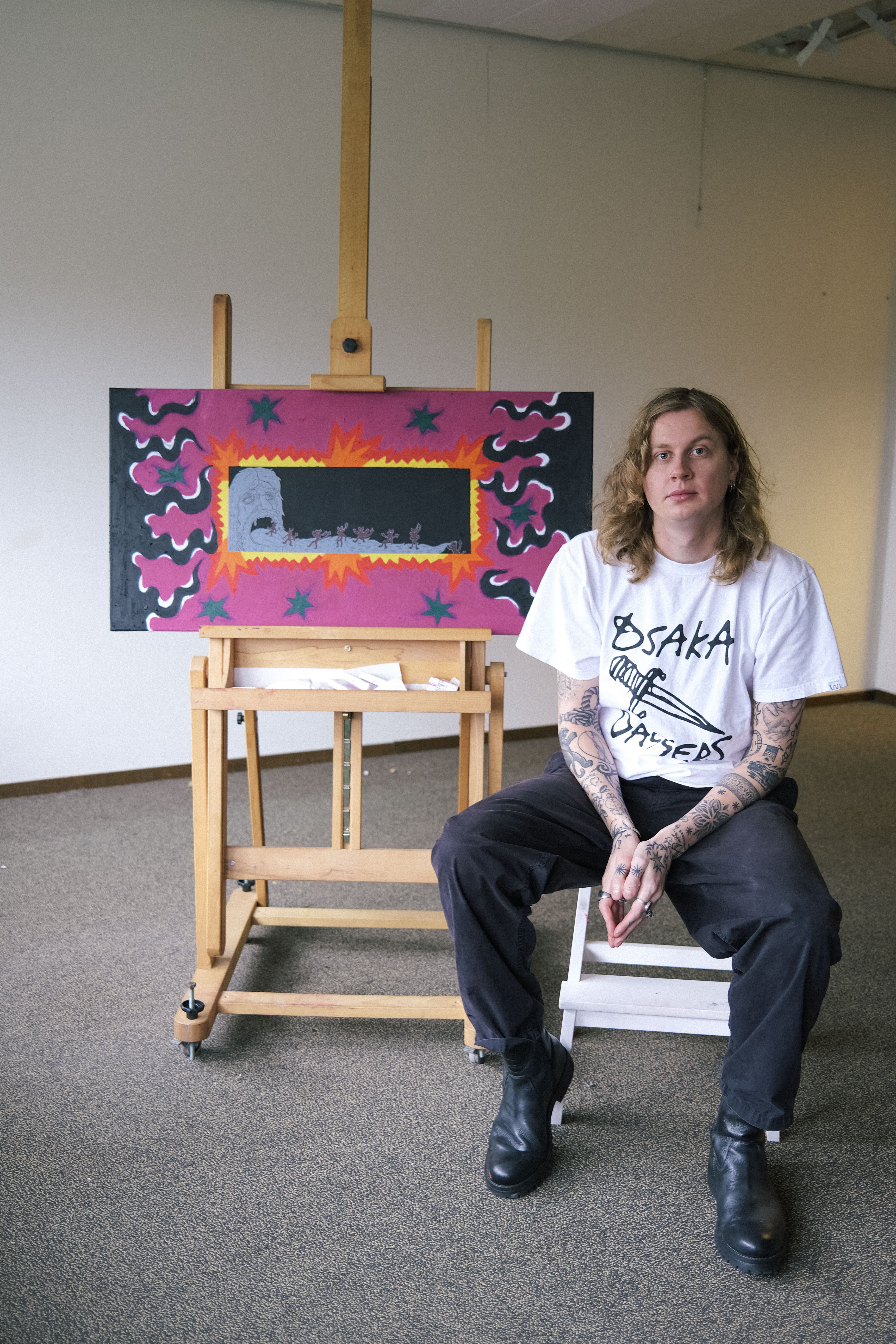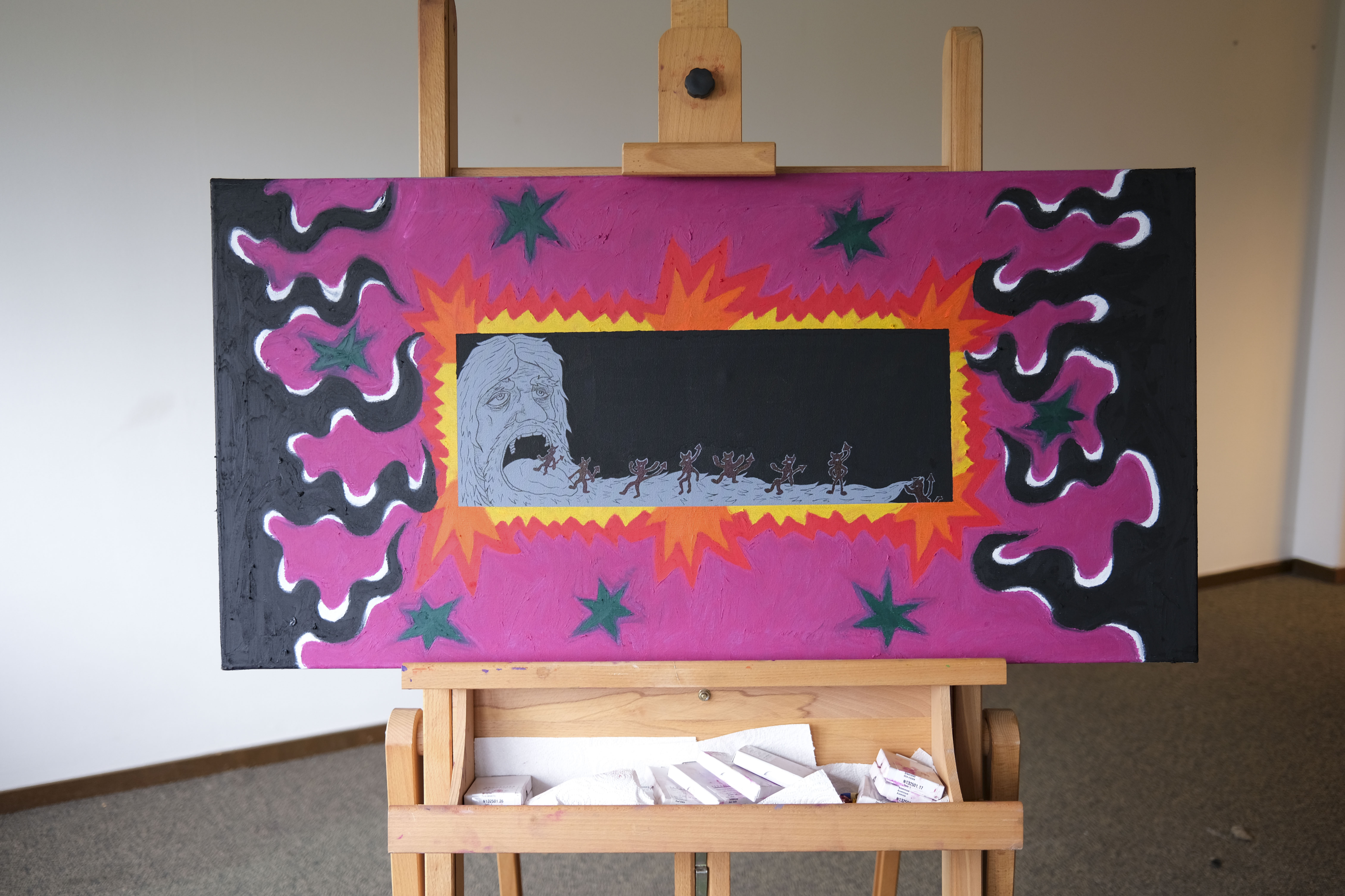Oil pastels and paint marker on 50×100 canvas.