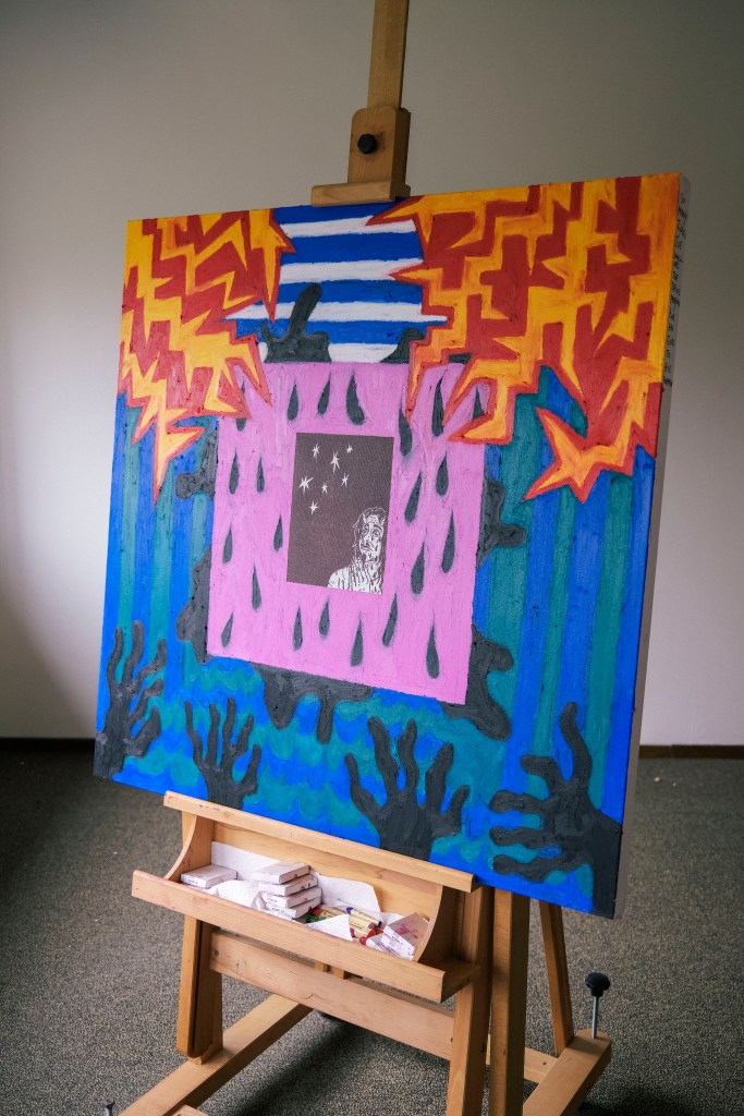 Oil pastels, sharpie, and paint marker on 100×100 canvas.