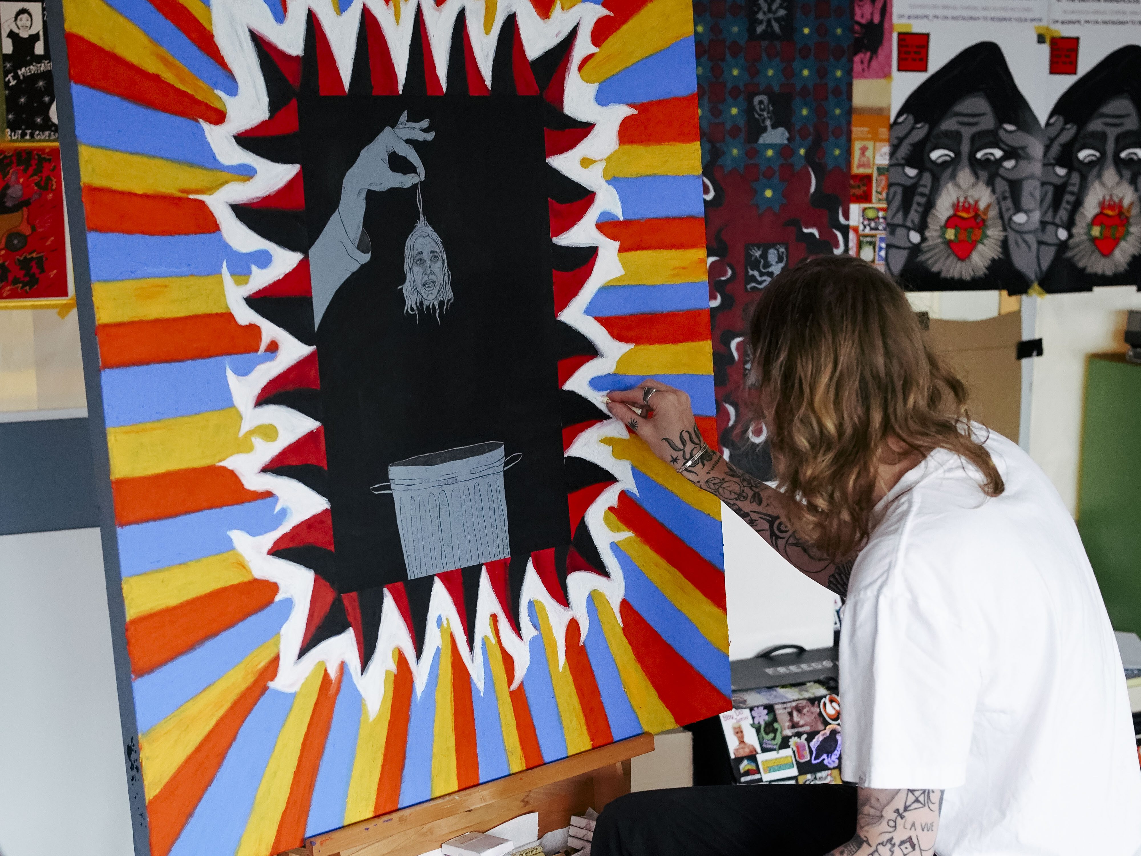 For as long as he remembers, Floris Olivier has felt the need to create. At school, he would spend all of his time drawing, but he never felt that he was good enough to seriously pursue it. There would always be someone better. Around his 17th, he discovered that he could write songs and perform them. It was like an epiphany. He was struggling with finding purpose in life, and finally, there it was. After attending a music education, leaving it unfinished, and spending years performing with his band Oliver Cried Wolf, a hand injury that turned to chronic pain took away the fun of being a musician. It was time to start exploring new avenues. This started with attempting a formal education in English literature. The degree was never finished, but during his studies, Floris was introduced to the Bible, as well as the idea of storytelling. This would sow the seeds for a lot of his current work. After leaving university, the search started again. A few years after leaving university, Floris attended an exhibition where the artist showed pages of his sketchbook. The art was rough, almost childish, but beautiful, and he imagined that, even with his limited skill, he would be able to do something similar. He bought some paper and a few pens, and started sketching again. When a friend asked if he could have one of the drawings for his wall, he realised this was something worth pursuing. He learned about illustration and digital drawing through friends and focused on these. After moving to Berlin in 2024, he decided to buy a canvas and try his hand at painting. It took some trial and error before he came to the style he currently works in; illustrations combined with bold colours and rough texture. He takes inspiration from subjects like religion, punk music, his mental health, and his perception of society and its flaws. He is currently working out of Leiden where his love of art and music are both fulfilled. He paints in his studio while singing and/or screaming along to his records. ✶✶✶